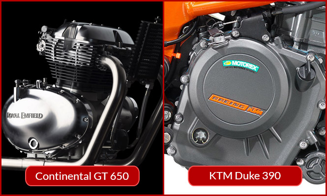 Design wise, the Royal Enfield Continental GT 650 follows retro styling though with a flair of sportiness. It features a round headlamp, twin-pod instrument cluster and heavy use of chrome across the body give the bike an old-school charm. While the fitments such as the clip-on handlebar and angular tank offer a sporty riding stance and dynamics. On the other hand, the KTM 390 Duke is a completely different motorcycle, an aggressive streetfighter with sharp and sleek styling across the bodywork.