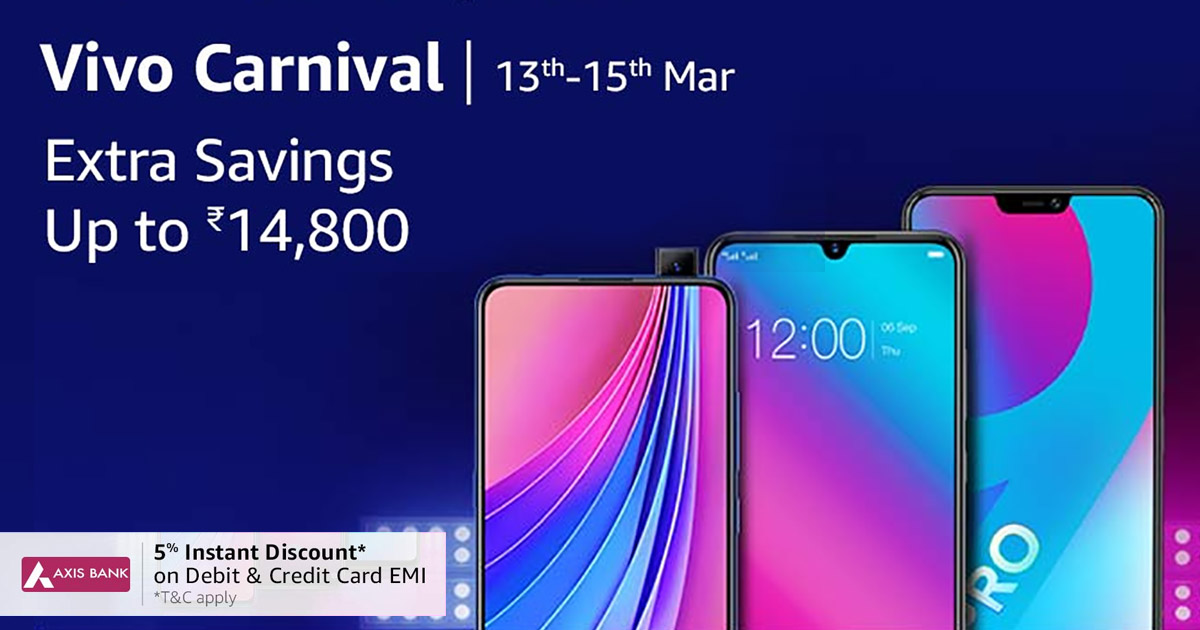 Vivo has kicked off a special sale for this Holi on Amazon. The Vivo Carnival sale starts from 13 March and will last till 15 March 2019. As per the company, customers can avail the benefits of up to 14,800 among which there will be exchange offer of up to Rs 8,000, up to Rs 1,000 instant cashback on Credit and Debit cards of Axis Bank and the customers can save up to Rs 5,800 on No-Cost EMI.