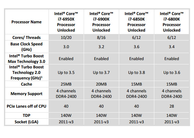 "The new Intel Turbo Boost Max Technology 3.0 steers applications to the highest-performing core, improving single-threaded performance by up to 15%," said the company. Intel will also offer its Extreme Edition processors in 8-core and 6-core versions- Core i7-6900K, Core i7-6850K, Core i7-6800K. All processors are fully unlocked for performance tuning. Other features include: Intel Hyper-Threading Technology, supports LGA 2011-v3 socket, Intel Ready Mode Technology, and X99 chipset compatibility.